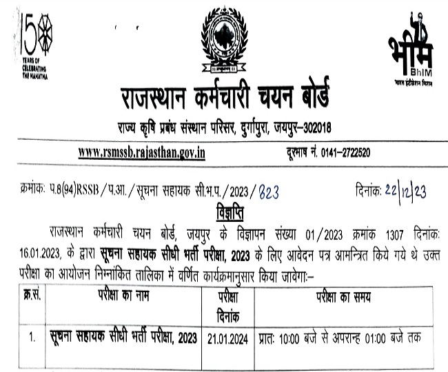एजुकेशन डेस्क, नई दिल्ली। राजस्थान स्टाफ सिलेक्शन बोर्ड, जयपुर की ओर से सूचना सहायक (Informatics Assistant) के पदों पर होने वाली भर्ती परीक्षा के लिए शेड्यूल घोषित कर दिया गया है। जिन उम्मीदवारों ने इस भर्ती में शामिल होने के लिए आवेदन किया था उनको बता दें कि इस भर्ती के लिए परीक्षा का आयोजन 21 जनवरी 2024 को किया जायेगा।