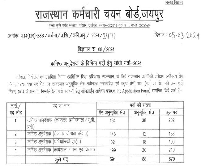 इस भर्ती के लिए माध्यम से कनिष्ठ अनुदेशक के कुल 679 रिक्त पदों पर नियुक्तियां की जाएंगी। पदानुसार भर्ती विवरण निम्नलिखित है-