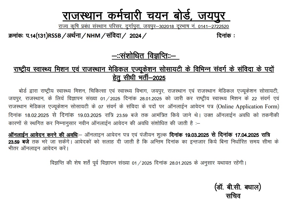 आरएसएसबी की ओर से साझा की गई डिटेल के मुताबिक "बोर्ड द्वारा राष्ट्रीय स्वास्थ्य मिशन, चिकित्सा एवं स्वास्थ्य विभाग, जयपुर, राजस्थान एवं राजस्थान मेडिकल एज्यूकेशन सोसायटी, जयपुर, राजस्थान, के लिये विज्ञापन संख्या 01/2025 दिनांक 28.01.2025 को जारी कर राष्ट्रीय स्वास्थ्य मिशन के 22 संवर्ग एवं राजस्थान मेडिकल एज्यूकेशन सोसायटी के 07 संवर्ग के संविदा के पदों पर ऑनलाइन आवेदन पत्र (Online Application Form) दिनांक 18 फरवरी 2025 से दिनांक 19 मार्च 2025 रात्रि 23.59 बजे तक आमंत्रित किये जाने थे। उक्त ऑनलाईन अवधि को तकनीकी कारणों से स्थगित कर निम्नानुसार नवीन ऑनलाईन आवेदन की अवधि संशोधित की जाती है।"