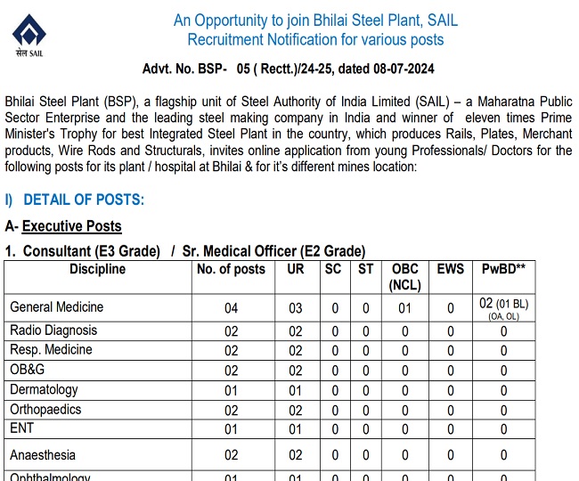 जॉब डेस्क, नई दिल्ली। सरकारी नौकरी की तलाश कर रहे युवाओं के लिए खुशखबरी है। स्टील अथॉरिटी ऑफ इंडिया लिमिटेड (SAIL) की ओर से मेडिकल ऑफिसर, असिस्टेंट मैनेजर, कंसल्टेंट समेत अन्य पदों पर भर्ती निकाली गई है। इस भर्ती के लिए ऑनलाइन एप्लीकेशन प्रॉसेस शुरू हो चुकी है जो निर्धारित अंतिम तिथि 3 अगस्त 2024 तक जारी रहेगी।