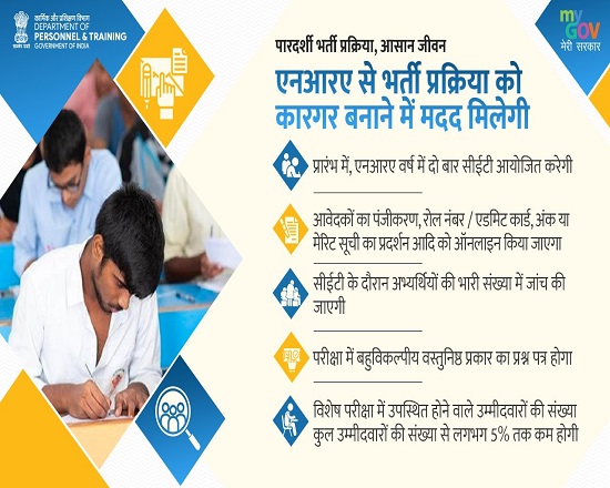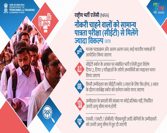 Common Eligibility Test (CET) सामान्य पात्रता परीक्षा का राष्ट्रीय भर्ती एजेंसी (NRA) वर्ष में दो बार आयोजन करेगी और इसमें प्रयासों की संख्या पर कोई प्रतिबंध नहीं होगा।