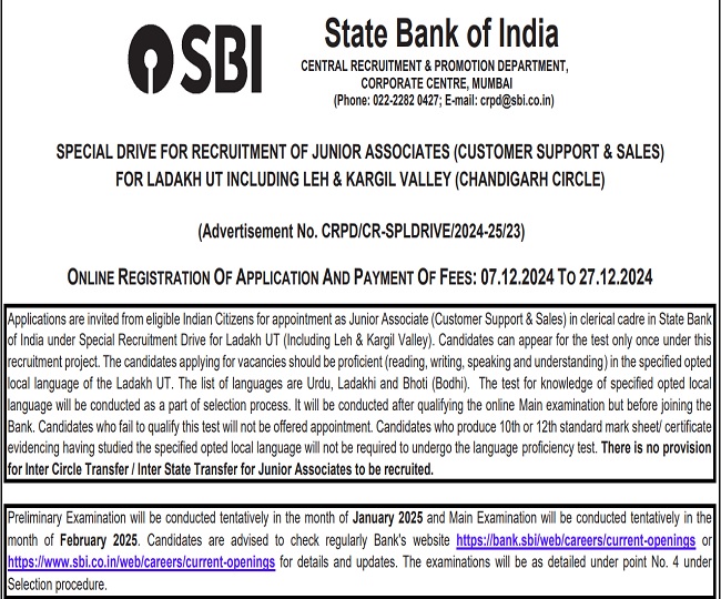 जॉब डेस्क, नई दिल्ली। स्टेट बैंक ऑफ इंडिया (SBI) की ओर से क्लर्क (Junior Associate) पदों पर भर्ती निकाली गई है। इस भर्ती के लिए आवेदन प्रक्रिया 7 दिसंबर से शुरू हो गई है जो 27 दिसंबर 2024 तक जारी रहेगी। जो भी अभ्यर्थी इस भर्ती के लिए पात्रता पूरी करते हैं वे तय तिथियों के अंदर ऑनलाइन माध्यम से एसबीआई की ऑफिशियल वेबसाइट www.sbi.co.in पर जाकर फॉर्म भर सकते हैं। इसके साथ ही आप इस पेज पर दिए गए लिंक का उपयोग करके भी आवेदन प्रक्रिया पूर्ण कर सकते हैं।