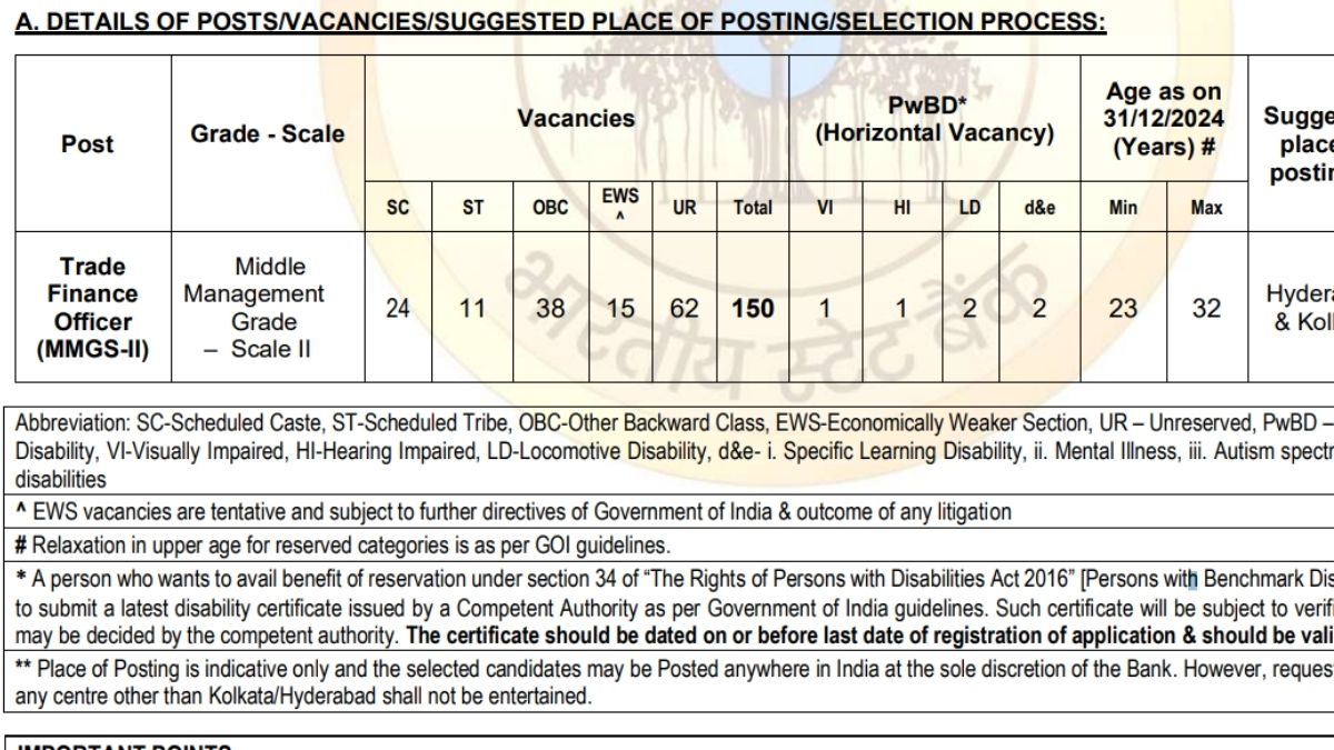 एसबीआई की ओर से जारी सूचना के अनुसार, इस भर्ती प्रक्रिया के माध्यम से कुल 150 पदों पर नियुक्तियां की जाएंगी। इन पदों के लिए एप्लीकेशन फॉर्म 23 जनवरी, 2025 तक स्वीकार किए जाएंगे। जारी डिटेल्स में आगे कहा गया है कि ट्रेड फाइनेंस ऑफिसर भर्ती के लिए आवेदन करने वाले अभ्यर्थियों की न्यूनतम आयु 23 साल से 32 साल के बीच होनी चाहिए। इन पदों पर आवेदन करने वाले अभ्यर्थियों को सलाह दी जाती है कि, वे एक बार नोटिफिकेशन को ध्यान से पढ़ लें और तभी अप्लाई करें, क्योंकि अगर आवेदन पत्र में कोई गडबड़ी पकड़ में आती है तो फिर आवेदन पत्र मान्य नहीं किया जाएगा।