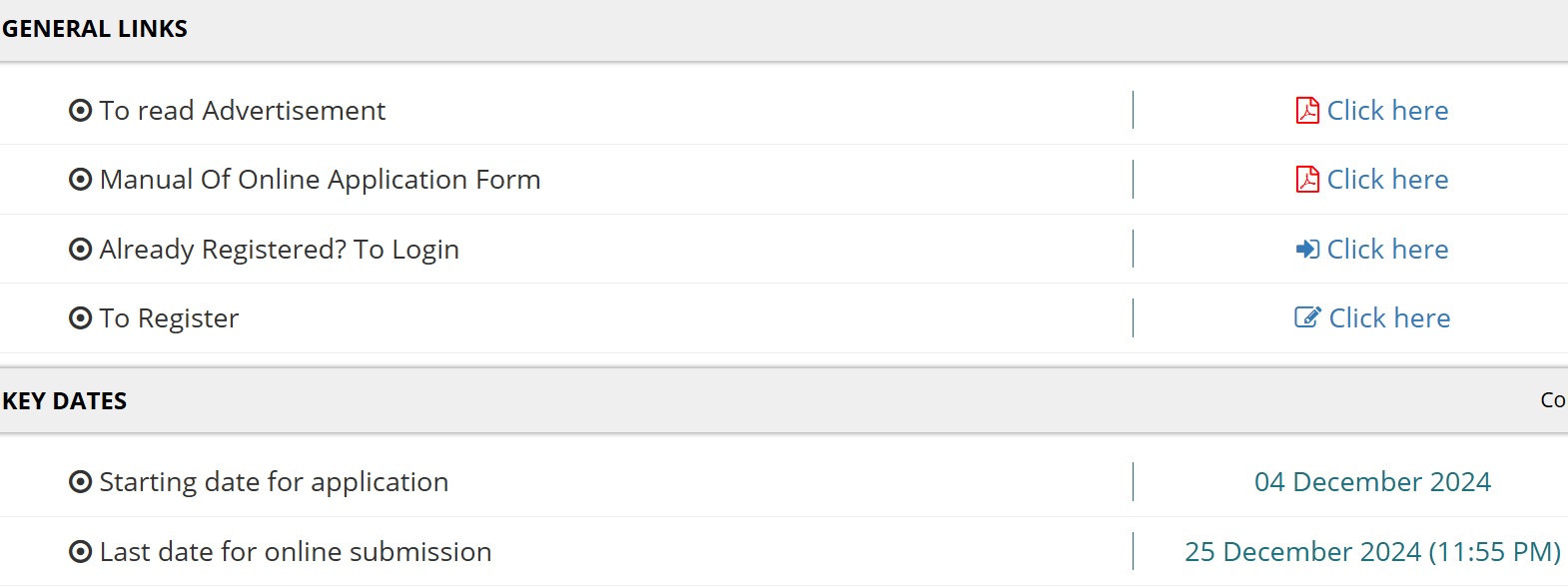 इस भर्ती में आवेदन करने के लिए उम्मीदवार सबसे पहले आधिकारिक वेबसाइट पर जाएं और यहां भर्ती से संबंधित लिंक पर क्लिक करें। अब भर्ती पोर्टल पर अभ्यर्थी पहले To Register लिंक पर क्लिक करें और मांगी गई डिटेल भरकर पंजीकरण कर लें। रजिस्ट्रेशन होने के बाद Already Registered? To Login पर क्लिक करके अभ्यर्थी आवेदन प्रक्रिया को पूर्ण कर लें। अंत में उम्मीदवार निर्धारित शुल्क जमा करें और पूर्ण रूप से भरे हुए फॉर्म को सबमिट कर दें। आवेदन शुल्क जनरल, ओबीसी एवं ईडब्ल्यूएस वर्ग के लिए 1000 रुपये और एससी/ एसटी/ पीएच के लिए 250 रुपये तय की गई है।