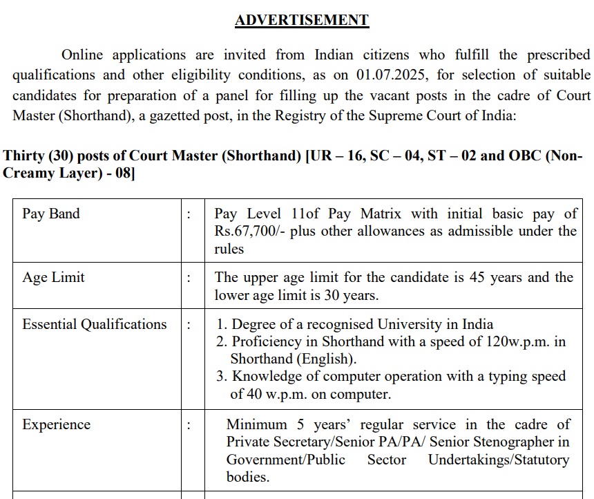 सुप्रीम कोर्ट मास्टर पदों पर आवेदन के लिए अभ्यर्थी ने किसी मान्यता प्राप्त विश्वविद्यालय/ संस्थान से ग्रेजुएशन किया हो। इसके साथ ही अभ्यर्थी की शॉर्टहैंड स्पीड 120 शब्द प्रति मिनट एवं कंप्यूटर टाइपिंग स्पीड 40 शब्द प्रति मिनट होनी चाहिए। उम्मीदवार के पास 5 वर्ष कार्य करने का अनुभव भी होना चाहिए।