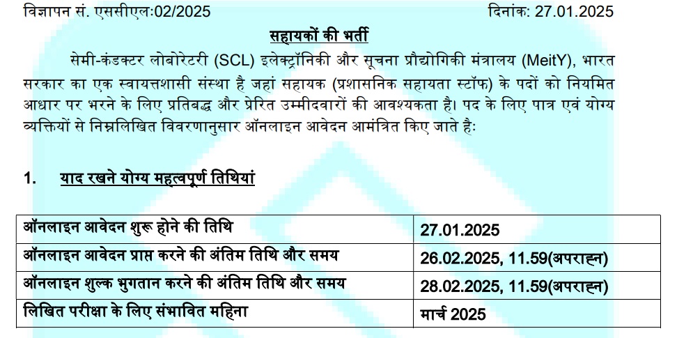 सेमी कंडक्टर लेबोरेटरी में असिस्टेंट पदों पर भर्ती निकाली गई है। जो भी अभ्यर्थी स्नातक उत्तीर्ण हैं और उन्हें कंप्यूटर की नॉलेज है वे इस भर्ती में शामिल होने के लिए ऑनलाइन माध्यम से आवेदन प्रक्रिया पूर्ण कर सकते हैं। ऑफलाइन आवेदन स्वीकार नहीं किये जाएंगे। फॉर्म भरने की लास्ट डेट 26 फरवरी 2025 तय की गई है। परीक्षा मार्च 2025 में आयोजित की जा सकती है।