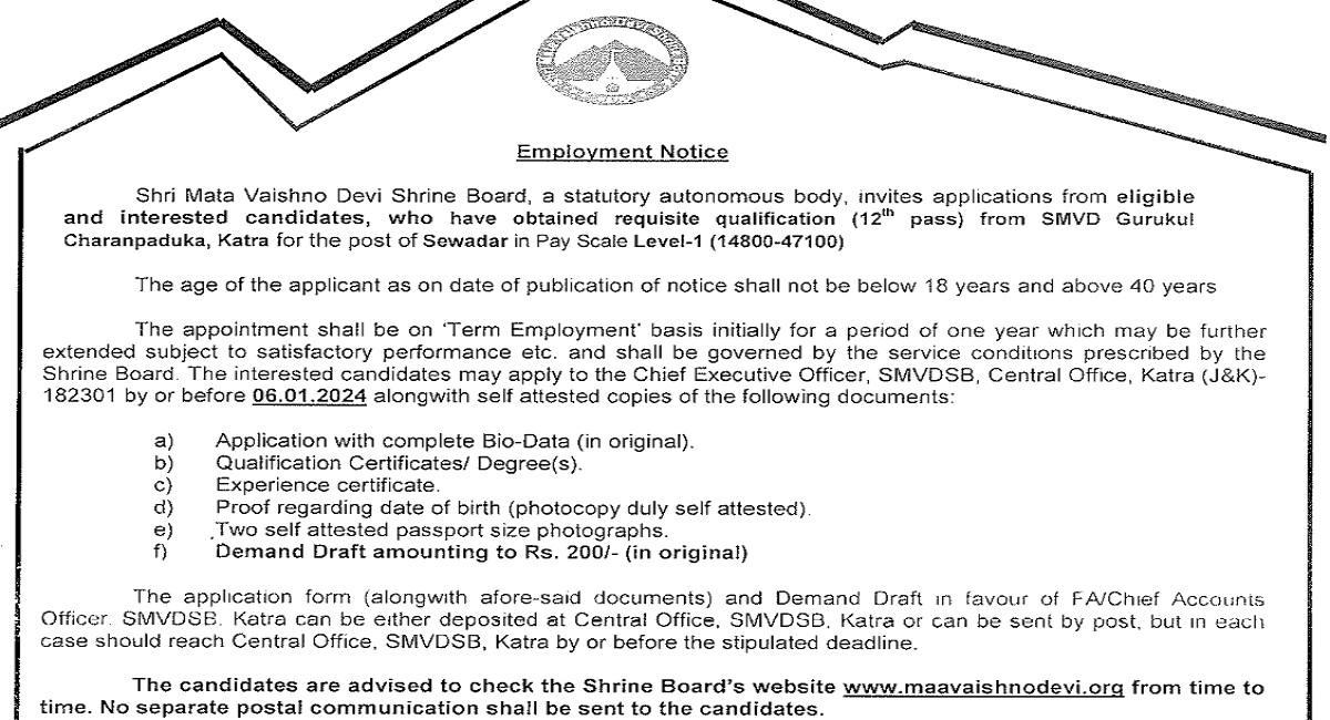 माता वैष्णों देवी श्राइन बोर्ड में सेवादारों के पदों पर निकली भर्ती, 12वीं उत्तीर्ण अभ्यर्थी कर सकते हैं अप्लाई