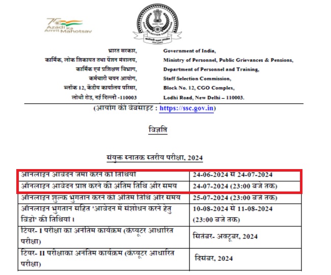 केंद्रीय मंत्रालयों विभागों और संगठनों में समूह ‘ख’ और समूह ‘ग’ के कुल 17 हजार से अधिक पदों पर सीधी भर्ती वाली कर्मचारी चयन आयोग (SSC) की संयुक्त स्नातक स्तरीय (CGL) परीक्षा 2024 में सम्मिलित होने के लिए 24 जून से चल रही आवेदन प्रक्रिया आज यानी बुधवार 24 जुलाई को रात 11 बजे समाप्त हो जाएगी। इस परीक्षा के लिए 100 रुपये शुल्क निर्धारित है।