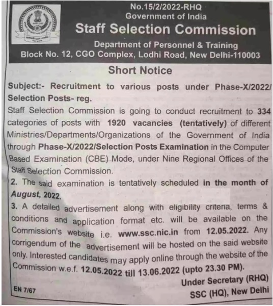 SSC Phase X 2022: कर्मचारी चयन आयोग 1920 रिक्तियों के लिए आयोजित करेगा सेलेक्शन पोस्ट फेज 10 परीक्षा, आवेदन 12 मई से