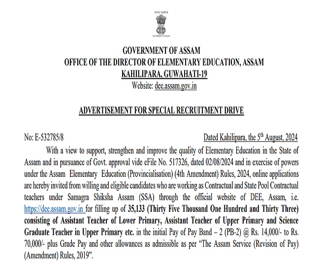जॉब डेस्क, नई दिल्ली। टीचर बनने का सपना देख रहे अभ्यर्थियों के लिए बड़ी खबर है। ऑफिस ऑफ द डायरेक्टर ऑफ एलिमेंट्री एजुकेशन असम की ओर से असिस्टेंट टीचर एवं सीनियर ग्रेजुएट टीचर के 35133 रिक्त पदों पर भर्ती निकाली गई है। इस भर्ती के लिए अधिसूचना जारी होने के साथ ही आवेदन प्रक्रिया भी शुरू कर दी गई है जो 12 अगस्त 2024 तक जारी रहेगी।