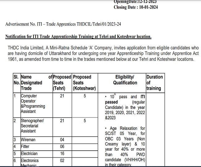 THDCL ITI Trade Apprentice: टीएचडीसी में ट्रेड अप्रेंटिस पदों पर निकली भर्ती, 10 जनवरी तक कर सकते हैं आवेदन