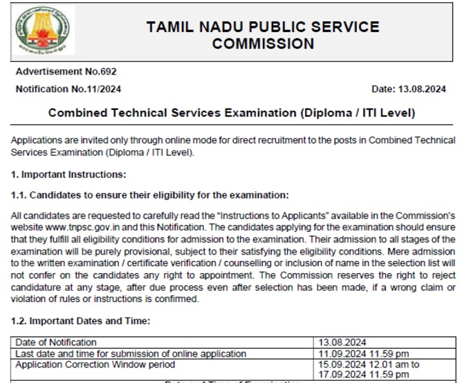 तमिलनाडु राज्य सरकार के तमाम विभागों में डिप्लोमा/ITI योग्यता वाले कुल 861 पदों पर सीधी भर्ती के लिए आयोजित किए वाले कंबाईंड टेक्निकल सर्विस एग्जाम (CTSE) 2024 में सम्मिलित होने के लिए जरूरी पंजीकरण की प्रक्रिया आज यानी मंगलवार 13 अगस्त से शुरू कर दी है। इच्छुक उम्मीदवार आयोग की आधिकारिक वेबसाइट tnpsc.gov.in पर एक्टिव लिंक से अप्लाई (TNPSC CTSE 2024 Registration) कर सकते हैं।