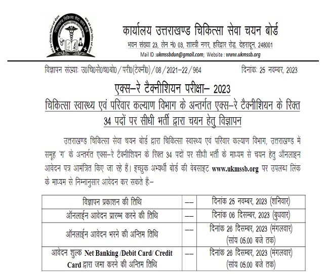 UKMSSB Recruitment 2023: उत्तराखंड में X-Ray Technician भर्ती के लिए नोटिफिकेशन जारी, इस दिन शुरू होंगे आवेदन