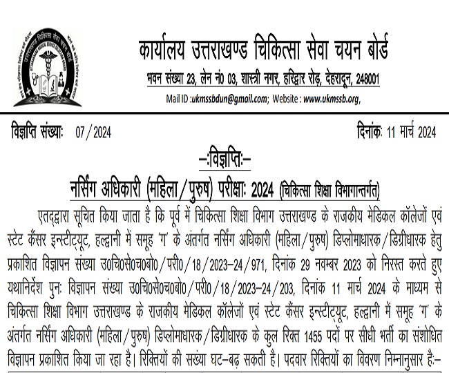 UKMSSB Recruitment 2024: उत्तराखंड नर्सिंग ऑफिसर पदों पर जल्द कर लें अप्लाई, 1455 पदों के लिए हो रही भर्ती