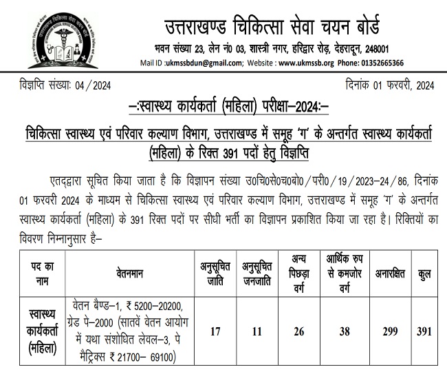 UKMSSB Recruitment 2024: उत्तराखंड महिला स्वास्थ्य कार्यकर्ता भर्ती परीक्षा के लिए नोटिफिकेशन जारी, 391 पदों पर आवेदन 13 फरवरी से