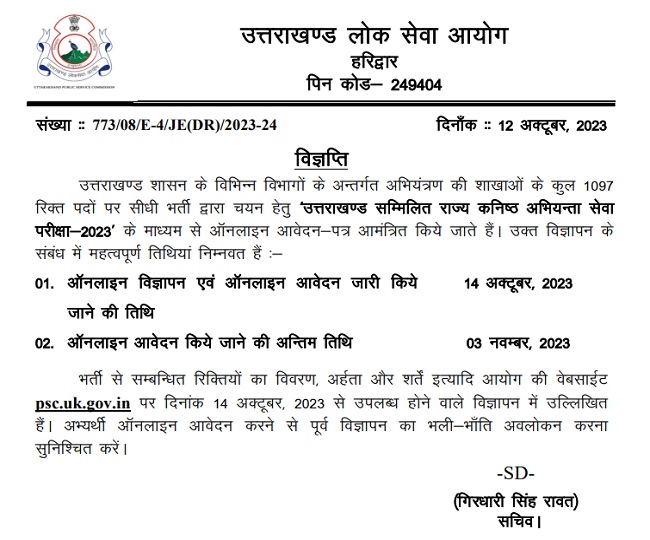 UKPSC JE भर्ती 2023 परीक्षा संक्षिप्त विज्ञप्ति डाउनलोड लिंक