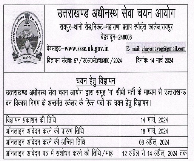 उत्तरखंड सब-ऑर्डिनेट सर्विस सिलेक्शन कमीशन (UKSSSC) की ओर से स्केलर के 200 रिक्त पदों पर भर्ती निकाली गयी है। इस भर्ती के लिए ऑनलाइन आवेदन प्रक्रिया शुरू हो चुकी है जो 8 अप्रैल 2024 तक जारी रहेगी। जो भी उम्मीदवार मान्यता प्राप्त बोर्ड से इंटरमीडिएट या इसके समकक्ष उत्तीर्ण हैं वे ऑनलाइन माध्यम से तय तिथियों में आवेदन प्रक्रिया पूर्ण कर सकते हैं।