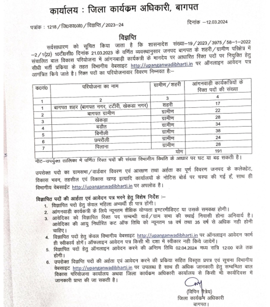 उत्तर प्रदेश के विभिन्न जिलों के जिला कार्यक्रम अधिकारी कार्यालयों द्वारा निकाली जा रही आंगनबाड़ी कार्यकत्रियों की रिक्तियों को लेकर अधिसूचना के माध्यम से उम्मीदवार आवेदन के लिए निर्धारित योग्यता मानदंड जान सकती हैं। इस क्रम में बागपत जिले के जिला कार्यक्रम अधिकारी द्वारा मंगलवार, 12 मार्च 2024 को जारी अधिसूचना के अनुसार आंगनबाड़ी कार्यकत्री की भर्ती (UP Aganwadi Bharti 2024) के लिए आवेदन निम्नलिखित पात्रता शर्तें हैं: