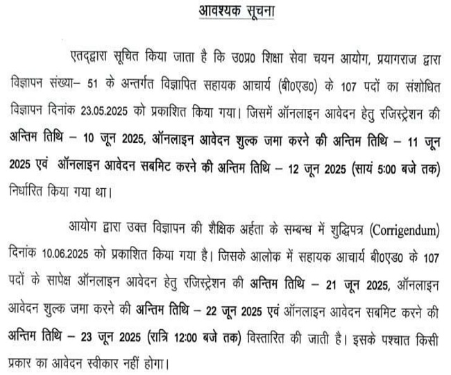 यूपी असिस्टेंट प्रोफेसर बीएड भर्ती के लिए एप्लीकेशन डेट एक्सटेंड, अब इस डेट तक कर सकते हैं अप्लाई