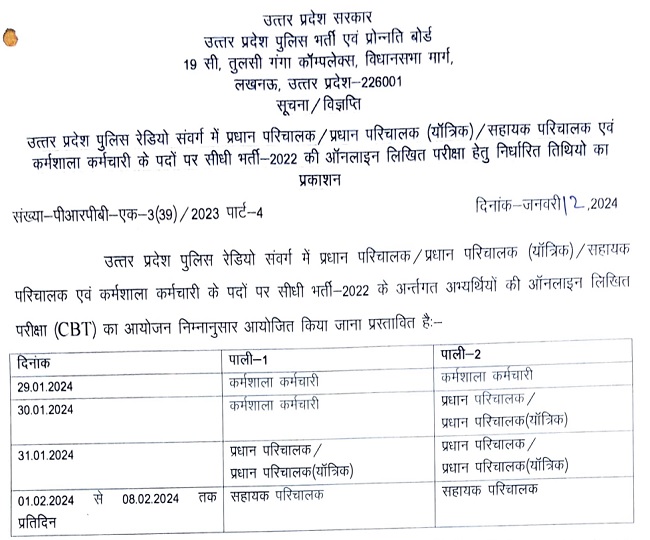 उत्तर प्रदेश पुलिस भर्ती एवं प्रोन्नति बोर्ड (UPPRPB) की ओर से यूपी पुलिस वर्कशॉप स्टाफ हेड एवं असिस्टेंट ऑपरेटर भर्ती 2022 के लिए कंप्यूटर बेस्ड टेस्ट (CBT) की डेट्स की घोषणा कर दी गयी गयी है। नोटिफिकेशन के अनुसार इन पदों पर सीबीटी एग्जाम का आयोजन 29 30 31 जनवरी एवं 1 से 8 फरवरी 2024 (प्रतिदिन) तक किया जाएगा।