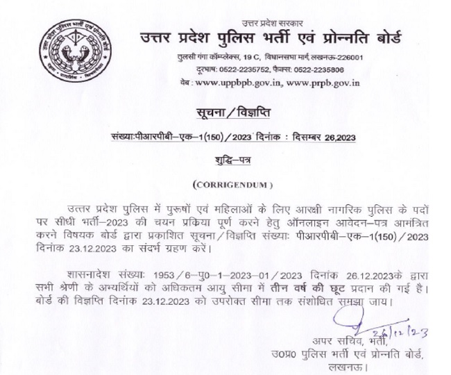 जॉब डेस्क, नई दिल्ली। उत्तर प्रदेश पुलिस भर्ती एवं प्रोन्नति बोर्ड (UPPRPB) ने राज्य पुलिस के नागरिक पुलिस संवर्ग में सिपाही रैंक के 60 हजार से अधिक पदों पर भर्ती के लिए 23 दिसंबर 2023 को जारी अधिसूचना में बदलाव किया है। बोर्ड द्वारा 26 दिसंबर को जारी संशोधन सूचना के मुताबिक इस भर्ती के लिए आवेदन हेतु निर्धारित अधिकतम आयु सीमा 22 वर्ष में 3 वर्ष की छूट दी गई है। ऐसे में सामान्य वर्ग के पुरुष उम्मीदवारों के लिए अधिकतम आयु सीमा 25 वर्ष और महिला उम्मीदवारों के लिए 28 वर्ष हो गई है। इसके अतिरिक्त आरक्षित वर्गों के लिए आरक्षण नियमों के अनुसार छूट भी लागू होगी।