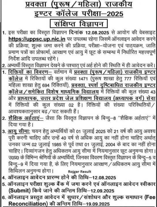 जॉब डेस्क, नई दिल्ली। उत्तर प्रदेश सर्विस कमीशन की ओर से स्टेट के राजकीय इंटर कॉलेज में प्रवक्ता (पुरुष/ महिला) के रिक्त पदों को भरने के लिए भर्ती निकाली गई है। अधिसूचना के मुताबिक इस भर्ती के लिए आवेदन प्रक्रिया 12 अगस्त से शुरू होकर 12 सितंबर 2025 तक जारी रहेगी। ऐसे में जो भी उम्मीदवार इस भर्ती के लिए पात्रता पूरी करते हैं वे आज से ही यूपीपीएससी की ऑफिशियल वेबसाइट uppsc.up.nic.in पर जाकर आवेदन पत्र भर सकते हैं। आवेदन में किसी प्रकार की त्रुटि होने पर 19 सितंबर 2025 तक उसमें संशोधन किया जा सकेगा।