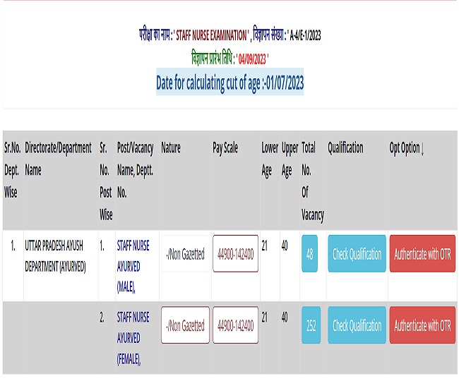 UPPSC Staff Nurse Recruitment 2023 उत्तर प्रदेश लोक सेवा आयोग की ओर से स्टाफ नर्स (आयुर्वेद) के पदों पर आवेदन की अंतिम तिथि को 11 अक्टूबर 2023 तक एक्सटेंड कर दिया गया है। जिन उम्मीदवार ने अभी तक किसी कारणवश आवेदन नहीं किया है वे तुरंत ही ऑफिशियल वेबसाइट पर जाकर फॉर्म भर सकते हैं। इस भर्ती के जरिये 300 पदों पर नियुक्तियां की जाएंगी।