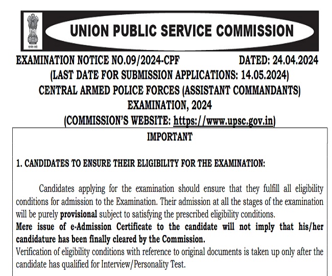 संघ लोक सेवा आयोग (UPSC) की ओर से सीएपीएफ (असिस्टेंट कमांडेंट) एग्जामिनेशन 2024 (UPSC CAPF Examination 2024) के लिए नोटिफिकेशन जारी कर आवेदन प्रक्रिया शुरू कर दी गई है। जो भी उम्मीदवार इस भर्ती की तैयारियों में लगे हैं वे निर्धारित अंतिम तिथि 14 मई तक फॉर्म भर सकते हैं। ऑनलाइन आवेदन से पहले पात्रता की जांच अवश्य कर लें।