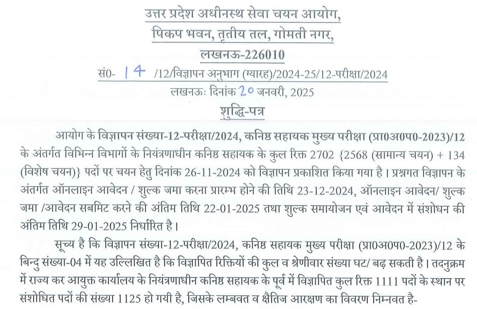 यूपीएसएसएससी की ओर से जूनियर असिस्टेंट भर्ती के पदों में बढ़ोत्तरी की गई है। पहले इस भर्ती के माध्यम से कुल 2702 पदों पर भर्ती होनी थी लेकिन अब इसे बढ़ाकर 3166 कर दिया गया है। इस भर्ती के लिए आवेदन की लास्ट डेट आज यानी 22 जनवरी निर्धारित है। ऐसे में योग्य एवं इच्छुक अभ्यर्थी इस भर्ती में शामिल होने के लिए जल्द से जल्द फॉर्म भर लें।