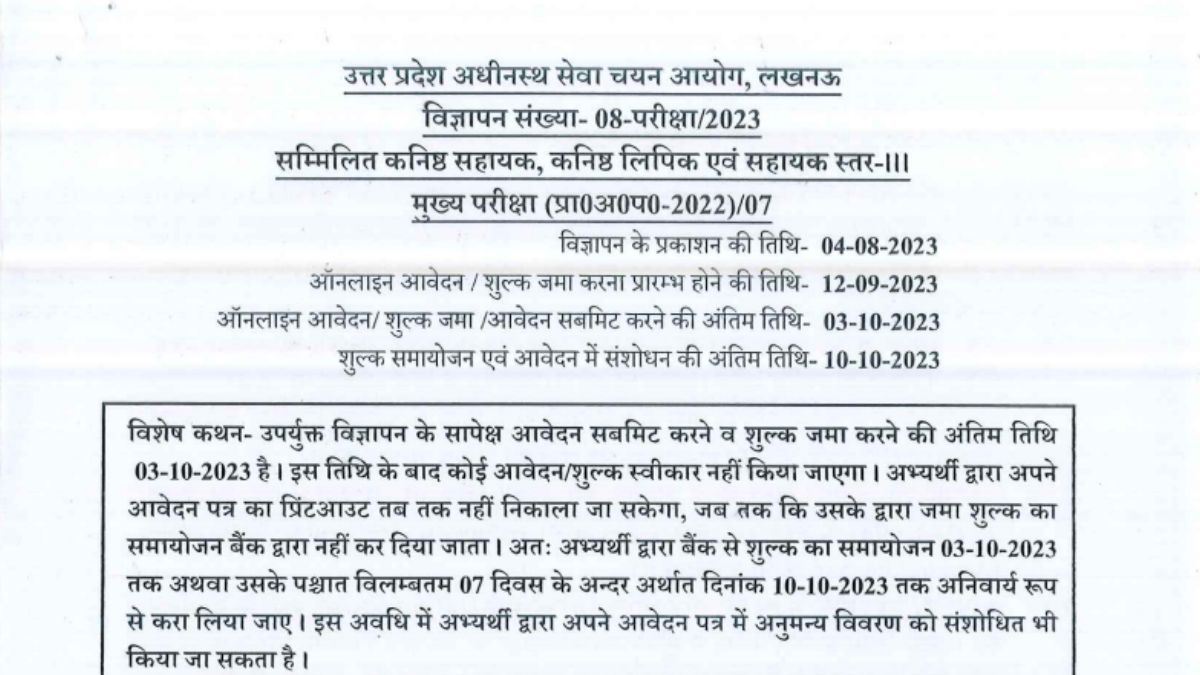 उत्तर प्रदेश अधीनस्थ सेवा चयन आयोग की ओर से जारी नोटिफिकेशन के मुताबिक, इस भर्ती अभियान के माध्यम से जूनियर असिस्टेंट, जूनियर क्लर्क और असिस्टेंट लेवल- III के कुल 3,831 पदों पर नियुक्तियां होनी हैं। इस भर्ती के लिए केवल वे उम्मीदवार ही योग्य होंगे, जो यूपीएसएसएससी प्रारंभिक पात्रता परीक्षा (पीईटी) 2022 में उत्तीर्ण हुए हैं।