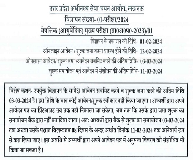 UPSSSC Recruitment 2024: उत्तर प्रदेश में आयुर्वेदिक पदों पर भर्ती के लिए नोटिफिकेशन जारी, आवेदन 12 फरवरी से होंगे शुरू
