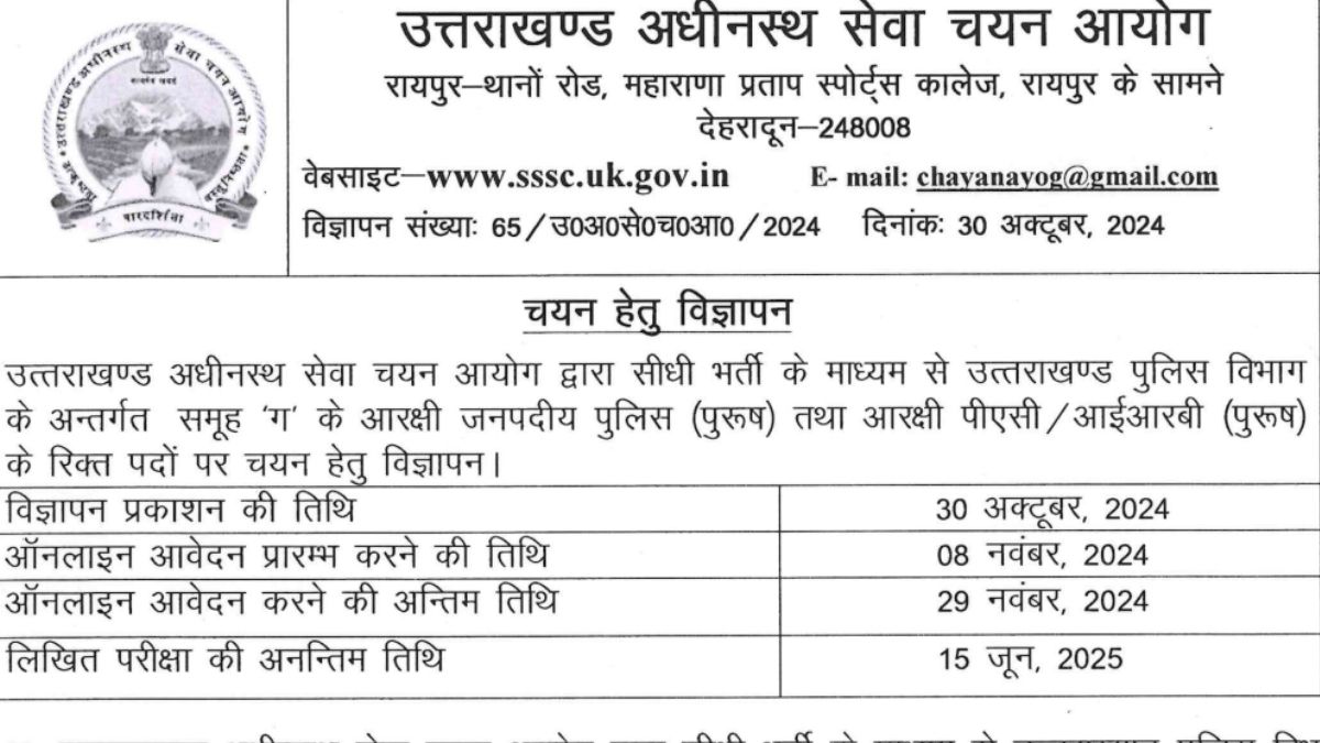 उत्तराखंड पुलिस कॉन्स्टेबल भर्ती के लिए नोटिफिकेशन जारी होने की तिथि- 30 अक्टूबर ,2024