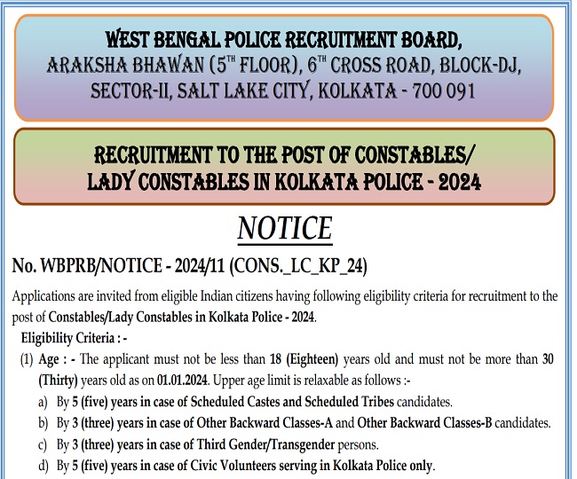 Kolkata Police Constable Recruitment 2024 नोटिफिकेशन डाउनलोड करने के लिए यहां क्लिक करें।
