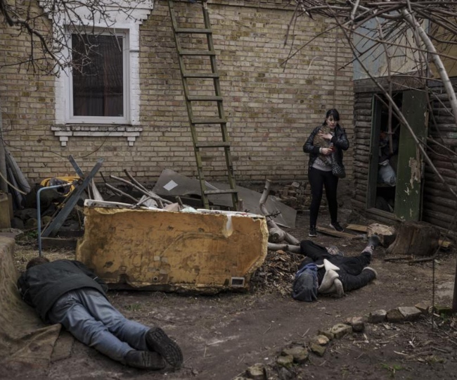 इस महिला का नाम ईरा गैवरिलुक है और इनके घर के बाहर इनके पति, भाई और एक अन्य व्यक्ति के शव पड़े हुए हैं। यह तस्वीर यूक्रेन के बाहरी इलाके बुचा की है और यह तस्वीर सोमवार, 4 अप्रैल, 2022 को ली गयी थी। (फोटो:एपी)