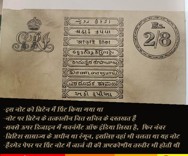 ढाई रुपये के नोट का साइज 12 गुणा 17 सेमी था। नोट पर एकतरफ दो रुपये आठ आना लिखा है। गौरतलब है कि देश में पहले आना प्रचलित था। उन दिनों ब्रिटिश राज में एक रुपये में 16 आने होते थे, इसलिए इसमें 2 रुपये के साथ आठ आना जोड़ा गया था। इस नोट को ब्रिटेन में प्रिंट किया गया था। हैंडमेड पेपर पर यह प्रिंट है। नोट पर जार्ज वी का चिन्ह भी होता था। इसमें उनकी अष्टकोणीय तस्वीर होती थी। नोट पर ब्रिटेन के तत्कालीन वित्त सचिव के दस्तखत हैं। सबसे ऊपर डिजाइन में गवर्नमेंट ऑफ इंडिया लिखा है। फिर नंबर।