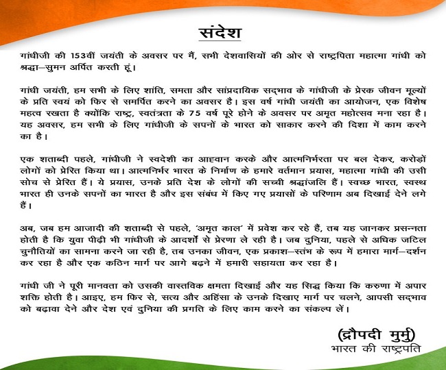 वहीं, राष्ट्रपति द्रौपदी मुर्मु ने भी राष्ट्रपिता महात्मा गांधी को श्रद्धांजलि दी। उन्होंने कहा कि गांधी की 153वीं जयंती के अवसर पर मैं सभी देशवासियों की ओर से राष्ट्रपिता महात्मा गांधी को श्रद्धा-सुमन अर्पित करती हूं।