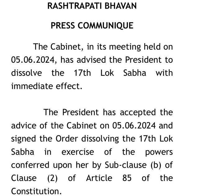 मोदी कैबिनेट की सिफारिश पर राष्ट्रपति ने भंग की 17वीं लोकसभा, NDA आज पेश करता है सरकार बनाने का दावा