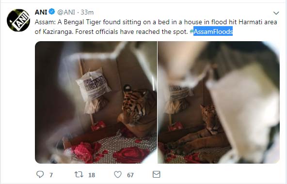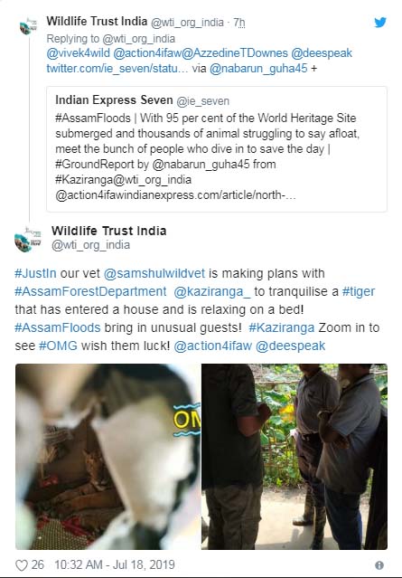 वाइल्ड लाइफ ट्रस्ट ऑफ इंडिया ने ट्विटर पर लोगों को एक बंगाल टाइगर के भाग निकलने की जानकारी दी और उसकी तस्वीर भी शेयर की। घर के पलंग पर आराम कर रहे शेर की फोटो के साथ कैप्शन में लिखा था- 'पशु चिकित्सक डॉ. समशुल अली असम वन विभाग के साथ बाघ को शांत करने के लिए एक योजना बनाने में व्यस्त हैं। दरअसल बाघ ने एक घर में प्रवेश किया है और वह एक बिस्तर पर आराम कर रहा है।' ट्रस्ट ने इस बाघ से जुड़े कई ट्वीट किए।