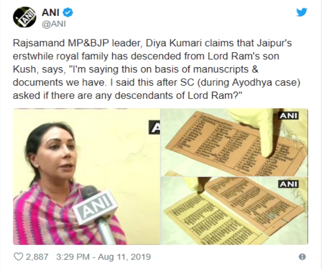 विभिन्न मीडिया रिपोर्ट में राम के वंशजों की ढेरों कहानियां मौजूद हैं। सुप्रीम कोर्ट में ये मुद्दा उठने के बाद एक बार फिर से खुद को प्रभु राम का वंशज बताने वाले दावेदारों की कहानियां सामने आने लगी हैं। जयपुर राजघराने की भाजपा सांसद दीया कुमारी ने अपने पोथीखाने में उपलब्ध हस्तलिपि, वंशावली व दस्तावेजों के आधार पर वंशज होने के सुबूत पेश किए हैं। दीया कुमारी ने रविवार को ट्वीट कर दावा किया कि जयपुर राजपरिवार की गद्दी भगवान राम के पुत्र कुश के वंशजों की राजधानी है। इतना ही नहीं उन्होंने ये भी कहा कि दुनियाभर में प्रभु राम के वंशज मौजूद हैं। इसमें उनका परिवार भी शामिल है, जो श्रीराम के पुत्र कुश के वंशज हैं।