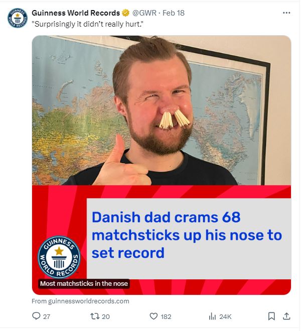 GWR वेबसाइट के अनुसार, डेनमार्क के पीटर वॉन टैंगेन बुस्कोव ने 'नाक में सबसे अधिक माचिस की तीलियां आयोजित करने" का विश्व रिकॉर्ड बनाया। वह यह रिकॉर्ड रखने वाले पहले ऐसे व्यक्ति हैं और इसे अर्जित करने के लिए उन्हें न्यूनतम 54 अंक प्राप्त करने की आवश्यकता थी। बुस्कोव ने अपने अनुभव को साझा करते हुए जीडब्ल्यूआर को बताया कि आश्चर्य की बात यह है कि इसकी वजह से वास्तव में मुझे कोई चोट नहीं पहुंची। उन्होंने आगे कहा, "मेरी नाक काफी बड़ी है और त्वचा काफी लचीली है। मुझे यकीन है कि इससे बहुत काफी मदद मिली।"