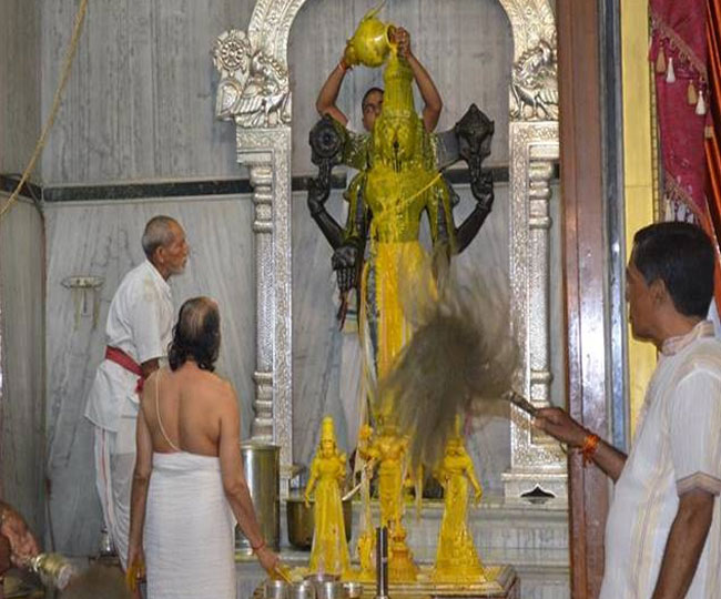 इंदौर, जेएनएन । मध्य प्रदेश के इंदौर स्थित तिरुपति बालाजी वेंकटेश देवस्थान गुमाश्ता नगर में भगवान बालाजी को भीषण गर्मी से निजात दिलाने का अनोखा तरीका अपनाया गया है। यहां भगवान बालाजी को गर्मी से राहत दिलाने के लिए 500 किलो आम के रस से उनका अभिषेक किया गया।