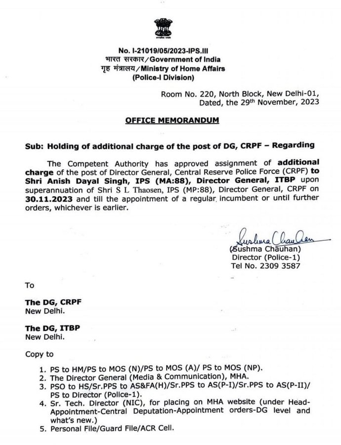 ITBP के महानिदेशक अनीश दयाल सिंह को सौंपा गया CRPF बल का अतिरिक्त प्रभार, 30 नवंबर को DG थाउसेन होंगे रिटायर