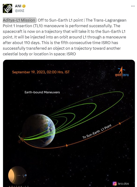नई दिल्ली, एएनआईः आदित्य-एल 1 मिशन (Aditya-L1 Mission) को लेकर बड़ी खबर सामने आई है। समाचार एजेंसी ANI की खबर के मुताबिक, आदित्य-एल 1 ने पांचवी बार सफलतापूर्वक अपनी कक्षा में परिवर्तन किया कर लिया है। इसे ट्रांस-लैग्रेंजियन पॉइंट 1 इंसर्शन (TL1I) कहा गया है।