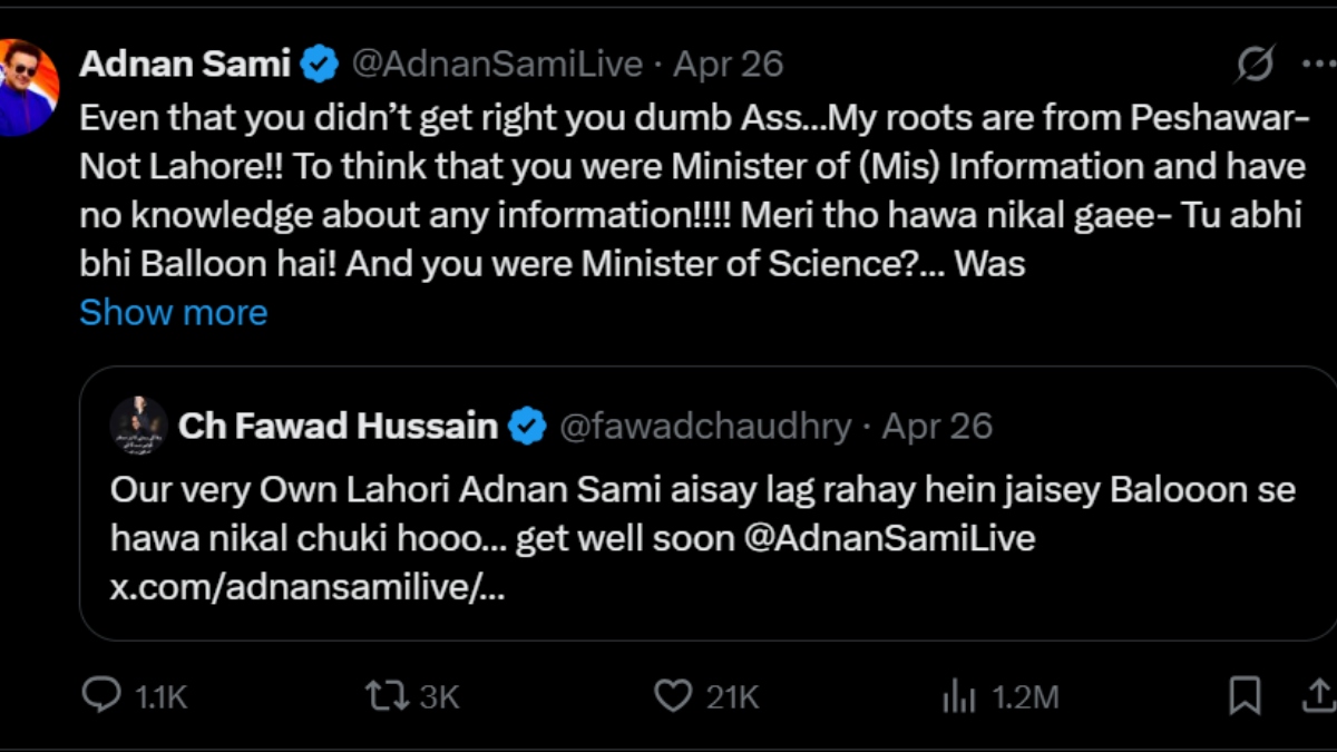चौधरी फवाद हुसैन ने शनिवार को एक भारतीय पत्रकार द्वारा एक्स पर लिखी गई एक पोस्ट को साझा किया, जिसमें केंद्र सरकार द्वारा पहलगाम हमले के बाद पाकिस्तानी नागरिकों को भारत छोड़ने के लिए कहने के बारे में बताया गया था और इसके साथ कैप्शन में लिखा था, "अदनान सामी के बारे में क्या?"