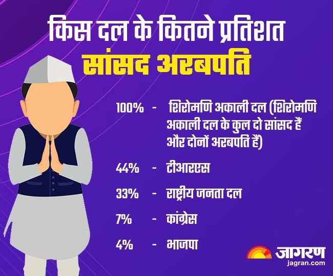 एडीआर ने अपनी रिपोर्ट में कहा कि भाजपा के 385 सांसदों की कुल संपत्ति 7,051 करोड़ रुपये, बीआरएस के 16 सांसदों की कुल संपत्ति 6,136 करोड़ रुपये, वाईएसआरसीपी के 31 सांसदों की कुल संपत्ति 4,766 करोड़ रुपये, कांग्रेस के 81 सांसदों की कुल संपत्ति 3,169 करोड़ रुपये और आम आदमी पार्टी के 11 सांसदों की कुल संपत्ति 1,318 करोड़ रुपये है।