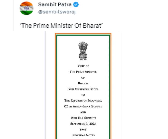 जी-20 शिखर सम्मेलन के अतिथियों को भेजे गए निमंत्रण पत्र में प्रेसिडेंट आफ भारत लिखने से छिड़ी बहस के बीच प्रधानमंत्री नरेन्द्र मोदी की इंडोनेशिया यात्रा के दस्तावेज में प्राइम मिनिस्टर आफ भारत लिखा गया है।भाजपा प्रवक्ता संबित पात्रा ने मंगलवार शाम को इस संबंध में सोशल मीडिया प्लेटफॉर्म X (पूर्व में ट्विटर) पर एक पोस्ट शेयर की हालांकि उनकी पोस्ट की जागरण आधिकारिक रूप से पुष्टि नहीं करता है।