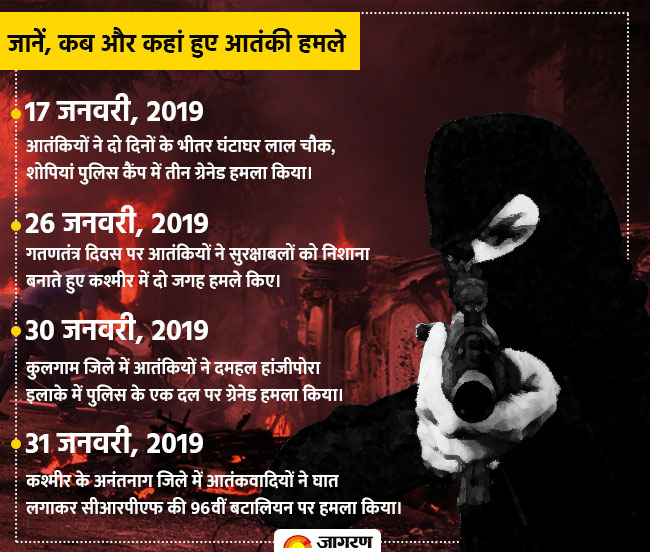 पुलवामा में आतंकी दस्तक का 10 दिन में ये तीसरा मामला है। बृहस्पितवार, 14 फरवरी 2019 को सीआरपीएफ के काफिले पर कार सवार आतंकी ने आत्मघाती हमले में कार में विस्फोट कर इस हमले को अंजाम दिया। बताया जा रहा है कि धमाका इतना जबरदस्त था कि काफिले में चल रहे कई वाहन इसकी चपेट में आ गए हैं। आतंकी संगठन जैश-ए-मोहम्मद ने इस हमले की जिम्मेदारी ली है। इससे पहले 12 फरवरी को भी सुरक्षा बलों की पुलवामा जिले के रतनीपुरा इलाके में आतंकियों से मुठभेड़ हुई थी। इस मुठभेड़ में सुरक्षा बलों ने एक आतंकी को मार गिराया था। हालांकि मुठभेड़ के दौरान एक जवान भी शहीद हो गया था, जबकि एक अन्य जवाब गंभीर रूप से घायल हुआ था। इससे पहले 06 फरवरी को भी पुलवामा जिले में सुरक्षाबलों और आतंकियों के बीच हुई मुठभेड़ में आतंकी संगठन लश्कर-ए-तैयबा (एलईटी) का एक स्वयंभू जिला कमांडर मारा गया था।