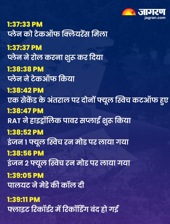 रिपोर्ट में बताया गया है कि टेकऑफ क्लियरेंस मिलने के बाद प्लेन ने रोल करना शुरू कर दिया और टेकऑफ के लिए जरूरी स्पीड मिलने के बाद दोपहर के 1:38:39 बजे इसने टेकऑफ कर दिया। 1:38:42 बजे प्लेन की रिकॉर्डेड एयरस्पीड 180 नॉट्स थी और यही वो वक्त था, जब प्लेन के इंजन 1 और 2 महज 1 सेकेंड के अंतराल से रन से कटऑफ की स्थिति में चले गए। इस वजह से प्लेन के इंजन में फ्यूल पहुंचना बंद हो गया और प्लेन नीचे आने लगा।