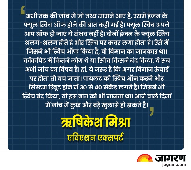 एविएशन एक्सपर्ट ऋषिकेश मिश्रा के मुताबिक, 'अभी तक की जांच में जो तथ्य सामने आए हैं, उसमें इंजन के फ्यूल स्विच ऑफ होने की बात कही गई है। फ्यूल स्विच अपने आप ऑफ हो जाए ये संभव नहीं है। दोनों इंजन के फ्यूल स्विच अलग-अलग होते है और स्विच पर कवर लगा होता है। ऐसे में जिसने भी स्विच ऑफ किया है, वो विमान का जानकार था।'
