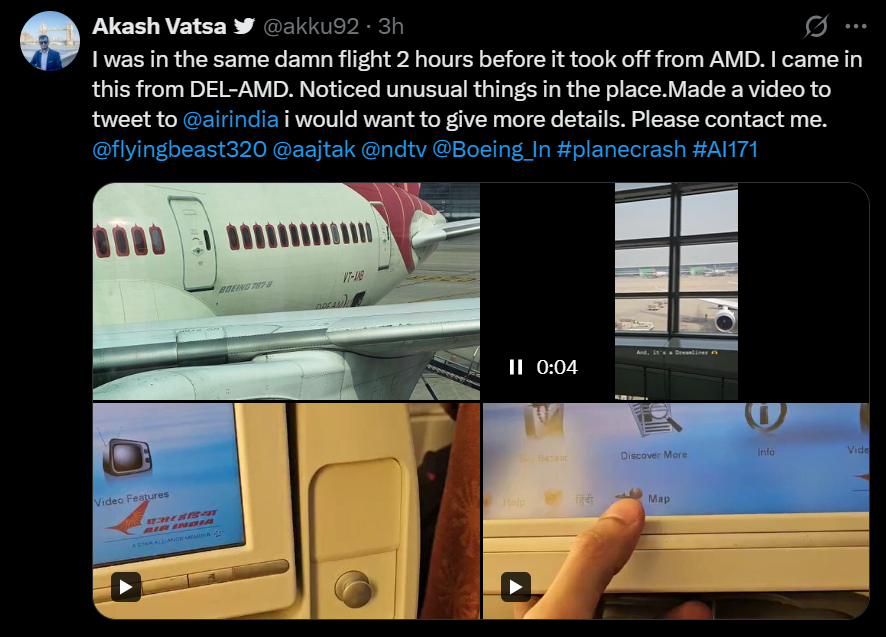 आकाश वत्स के मुताबिक, उन्होंने दिल्ली से अहमदाबाद जाना था, इसलिए उन्होंने एअर इंडिया की फ्लाइट बुक की थी। अहमदाबाद में फ्लाइट के लैंड होने के बाद वह उतरकर अपने घर चले गए। इसके कुछ समय बाद फ्लाइट ने लंदन के लिए टेक ऑफ किया और फिर यह हादसा हो गया।